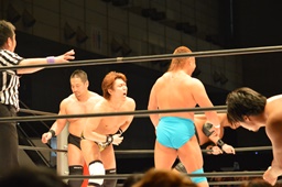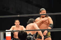 ビッグブーツ(右写真)、高木にタッチ。宮武も松永にタッチ。