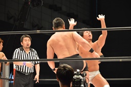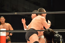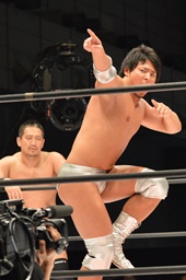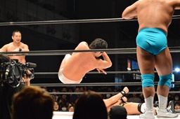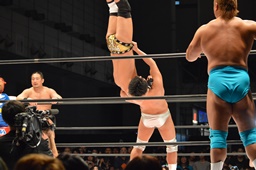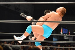 勝俣ボディスラムからカバー、2で返されるとジャンプしてダブルフットスタンプ(左写真)。