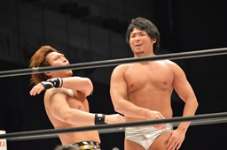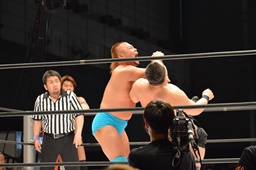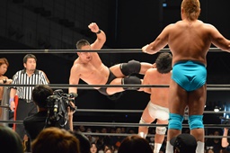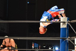 平田ロープに飛ぶ、松永カウンターのトミーボンバー(左写真)、コーナーに振って串刺しでもう一発。