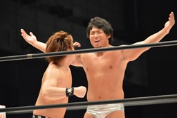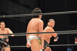 平田嬉しそうにリングイン(右写真)。宮武は松永にタッチ。平田エルボー、松永かわして逆さ押さえ込み、今度は2でキックアウト。松永エルボー、勝俣にタッチ。