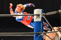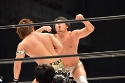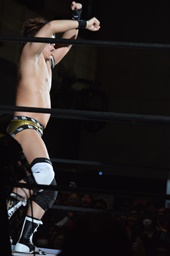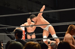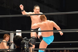 松永コーナーに上る、高木下からロケットパンチ(右写真)でエプロンに落とし、ぶっこ抜き雪崩式ブレーンバスター。ここで平田がタッチ要求、あまりの熱意に高木はタッチ。