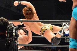 ムーンサルトプレス(左写真)、カウント2。