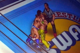 対戦相手のあろまほっとは石森太二似の「西織大志」を選択、2丁目ビーノvs西織大志のシングルマッチがスタート(左写真)。