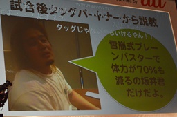 試合後タッグパートナーのヤス・ウラノから「雪崩式ブレーンバスターで体力が70%も減るのは坂井君だけだよ」など1時間以上説教されたらしい(左写真)
