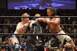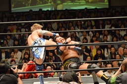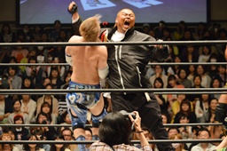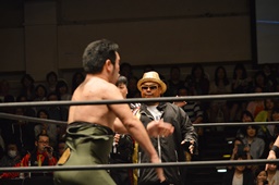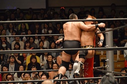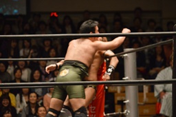高木コーナーに上ってドラゴンリングイン、彰人がガットショットで迎撃(右写真)。