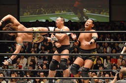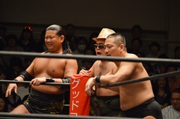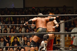 大石入ってダブルの攻撃狙うが高木は彰人と大石をコーナーに振り、まとめて担ぐと(右写真)後ろに放り投げる。5分経過。