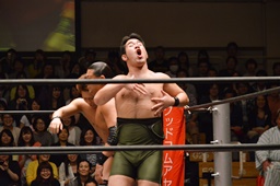 大石と彰人がトミーにダブルのバックエルボー(右写真)、