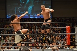大石キック、ロープに飛ぶ、トミーはカウンターのトミーボンバー(左写真)、大鷲にタッチ。
