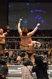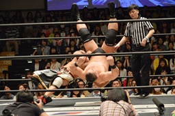 高木が平田を肩車してシットダウンひまわりボム(右写真)、カウント3。
