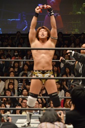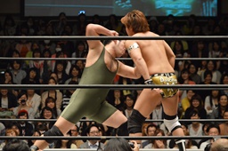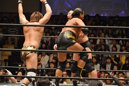 高尾ドロップキック(左写真)、ロープに振る、大鷲フライングクロスアタック、高木にタッチ。