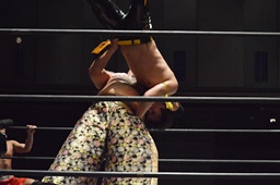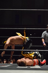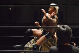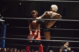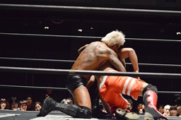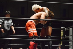 KUDOにボディスラム、突っ張りでコーナーに押し込んでブレーンバスター(左写真)、カウント2。中津にタッチ。