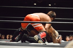 KUDOボディスラムから倒立式ダブルニードロップ(左写真)、カウント2。5分経過。