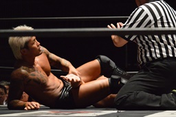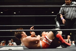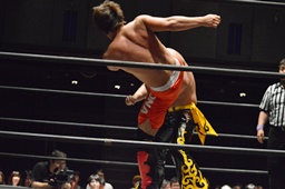 坂口かバー、中津下から十字に(右写真)、KUDOがダイビングダブルニードロップでカット。