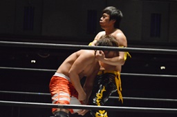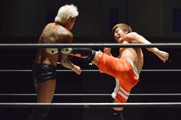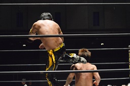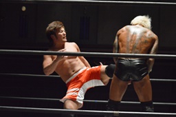 KUDO延髄蹴り(左写真)、坂口にタッチ。
