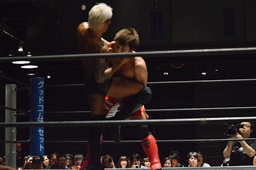 中津エルボー、KUDOヒザ蹴り(右写真)。