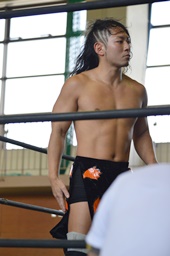 高梨入場(左写真)。新人相手の試合なのに普通にKUDOと坂口が帯同。