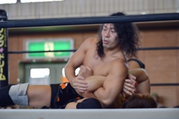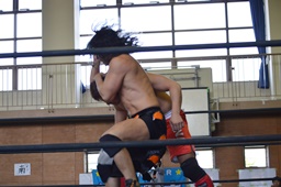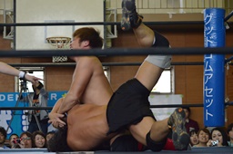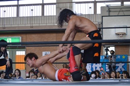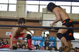 中津切り返してホイップ(右写真)、アームロック、高梨ヘッドシザーズでブレーク。