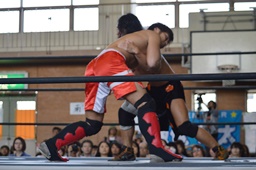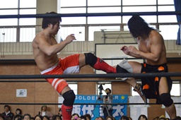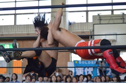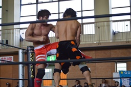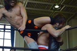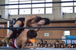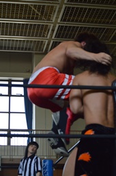 高梨ロープに振る、中津ショルダーブロック(右写真)。コーナーで逆水平の打ち合い。