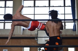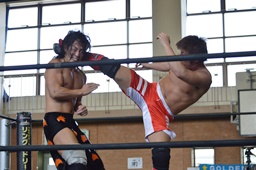 中津ジャーマン狙う、高梨サムソンクラッチ(右写真)、