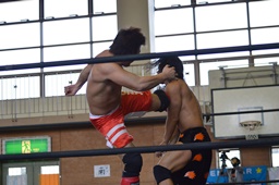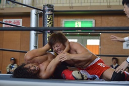 高梨腕取って切り返す(右写真)、中津切り返してヘッドロック、高梨切り返す。