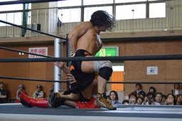 中津コーナーに振って串刺しニーアタック(右写真)。