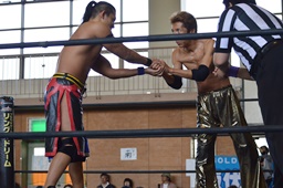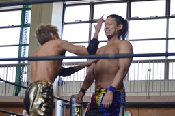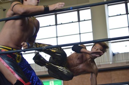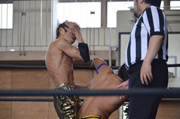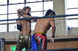 彰人ロープに振る、松野切り返してコルバタ(左写真)。
