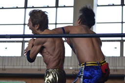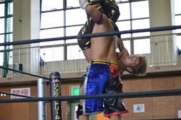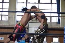 ロックアップ、彰人が腕を取る、松野切り返す(左写真)、ハンマーロックに、