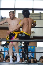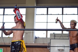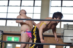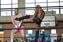 大石がKUDOをロープに振ってカニばさみ、男色が待ち構えて男色三角絞めに(右写真)。