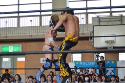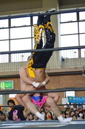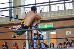 坂口が大石の尻にヒザ蹴り、引き倒したところにKUDOコーナーに上って地獄の断頭台(右写真)。