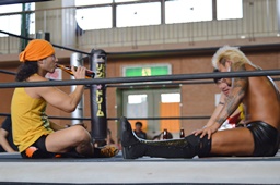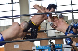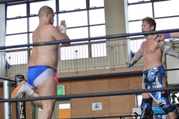 ロープに振ってKUDOがミドル、坂口がローを同時に(右写真)。