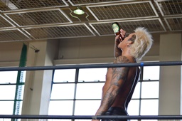 KUDOは大石をケツに突っ込ませるべくドロップキック、大石かわす(右写真)。
