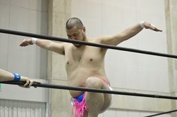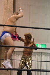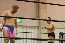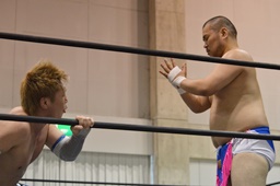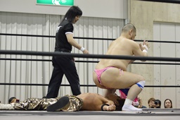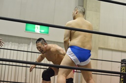 ロックアップ、高木が腕をひねる、男色切り返して自分の股間に(左写真)。高木切り返すが男色はまた切り返して自分の股間に。両軍タッチ。