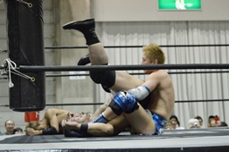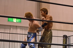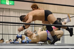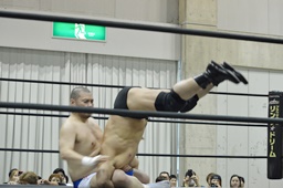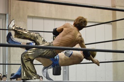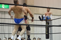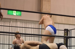 河津落とし(右写真)かtらレッグドロップ、エルボードロップ、カウント2。