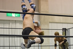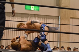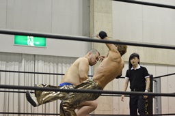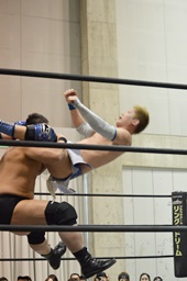 ロックアップ、大石腕を取る、松野が切り返してハンマーロックに(右写真)。
