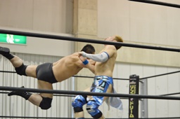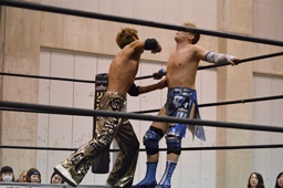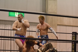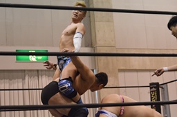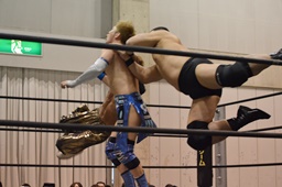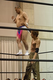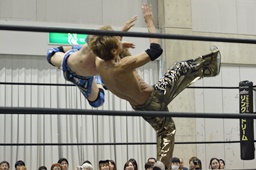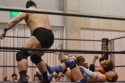 高木と松野ダブルのガットショットからダブルのフライングクロスアタック(右写真)。