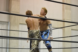 高木ロープに振ってフライングクロスアタック(右写真)から619。松野にタッチ。