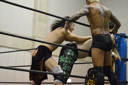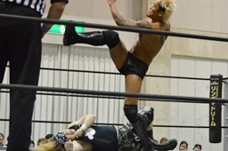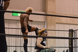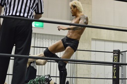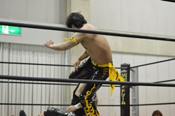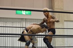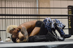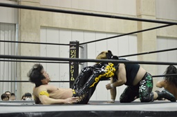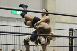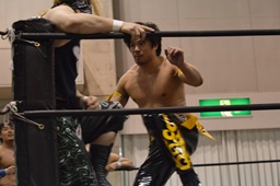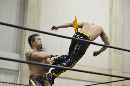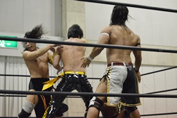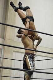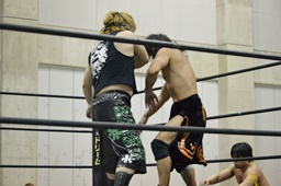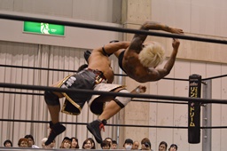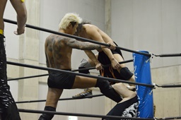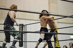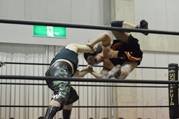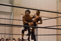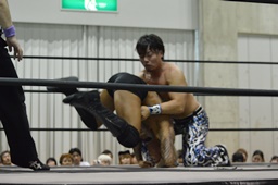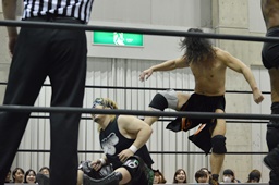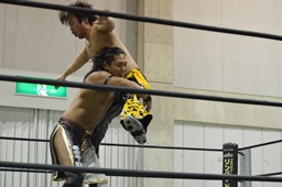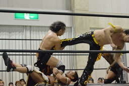彰人持ち上げてブレーンバスター(右写真)。彰人ロープに飛ぶ、坂口カウンターのドロップキック、KUDOにタッチ。
