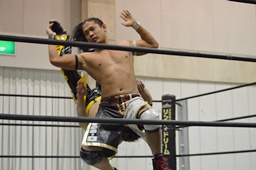 KUDOスワンダイブミサイルキック(左写真)、彰人吹っ飛んでHARASHIMAにタッチ。