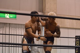 坂口上になってニーオンザベリー(左写真)、HARASHIMAコーナーに連れ帰り彰人にタッチ。坂口もKUDOにタッチ。