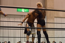 ウラノエルボー(右写真)、ロープに飛ぶ、高梨はKUDOとタッチしてウラノの足を引っ張る。