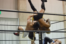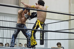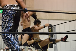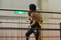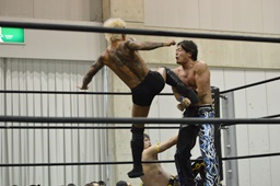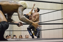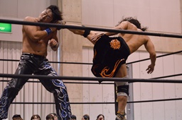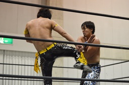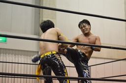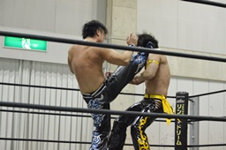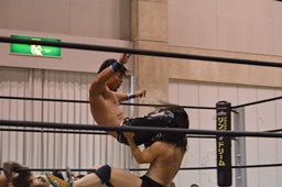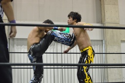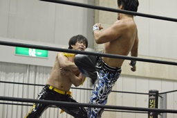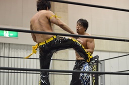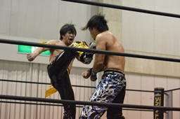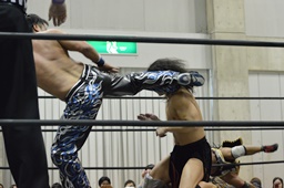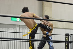 ウラノがKUDOにラリアット、KUDOはその腕で逆上がり(右写真)、