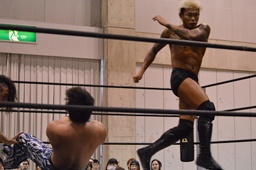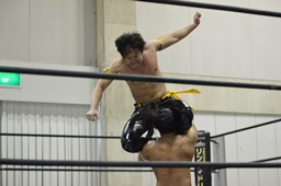 KUDOが彰人にダイビングニーアタック(左写真)。