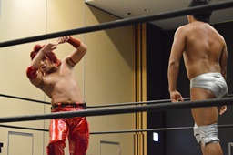 再度ショルダーブロックからの筋肉ポーズ(左写真)。イラついたのか高尾は宮武の足を踏む。