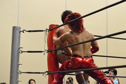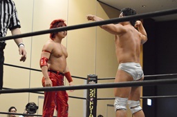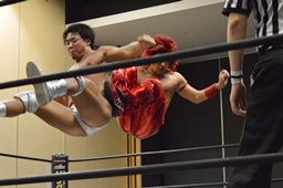高尾ロープに振る、宮武切り返してフライングバックエルボー、高尾ドロップキックで迎撃(左写真)。