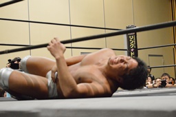 高尾ロープに振る、宮武フライングバックエルボー、今度は決まる(左写真)、カウント2。