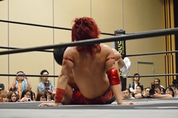高尾エルボー連打、ローリングエルボー(左写真)、カウント2。コーナーに上ってダイビングフットスタンプ、カウント3。
