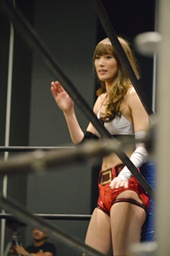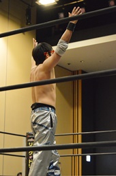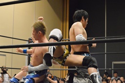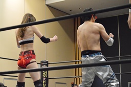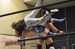 高木ドラゴンリングイン、大石ガットショットで迎撃。ロープに振る、高木切り返してフライングクロスアタック(左写真)。そして619。