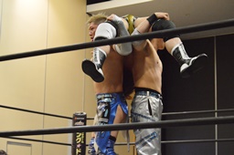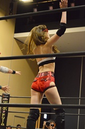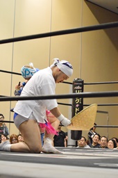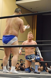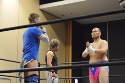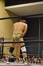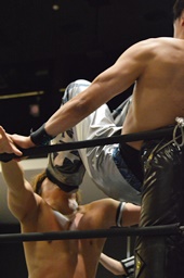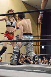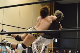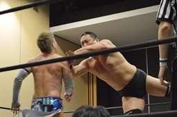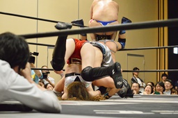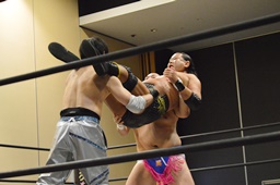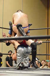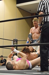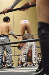 MIKAMIと大石の2人を担いで投げ落とす(右写真)。赤井が男色にサッカーカッター。旭が阿吽。