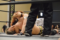 男色入ってリングに寝っ転がる。大石がロープに振ってカニばさみ、男色三角絞めに。大石がカンパーナ式ナイトメア(右写真)、MIKAMIにタッチ。