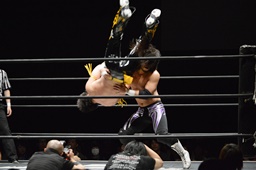 コーナーに上って佐々木にダイビングダブルニーアタック(右写真)、カバーは樋口がカット。